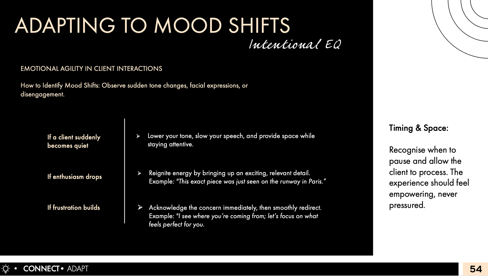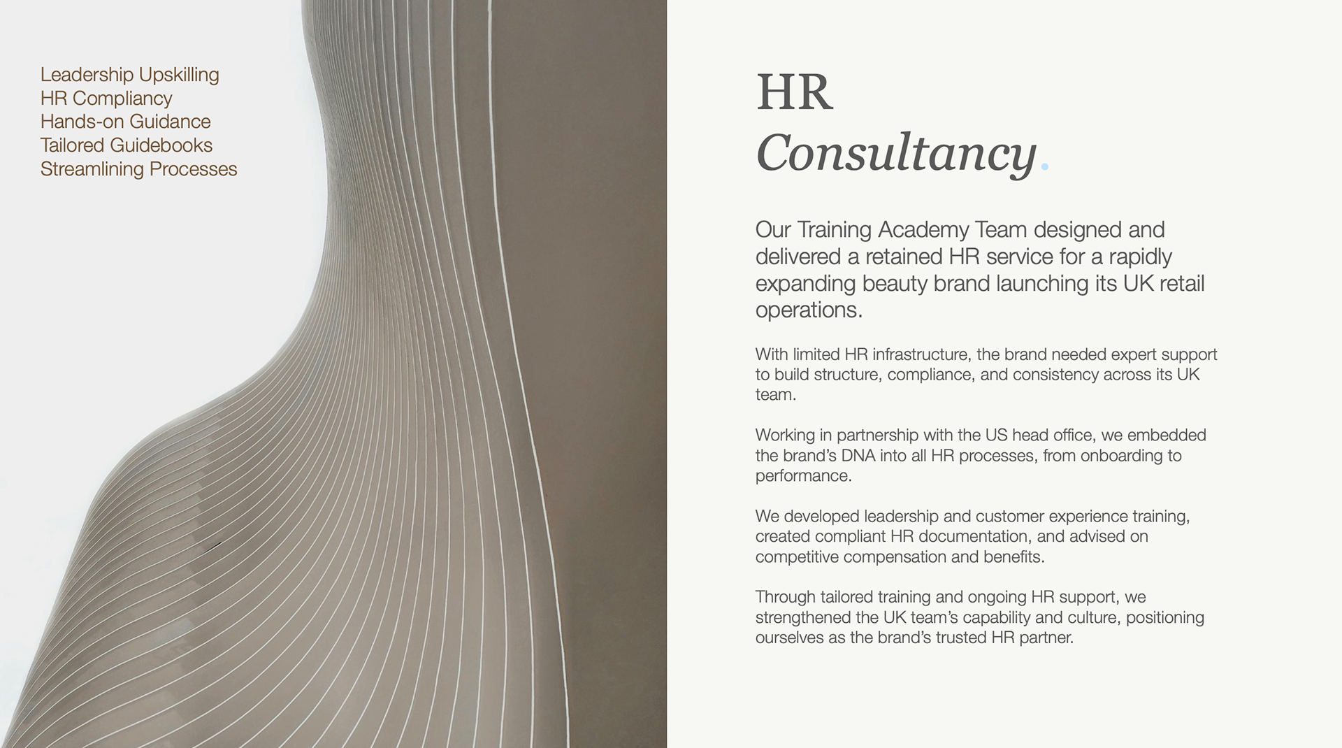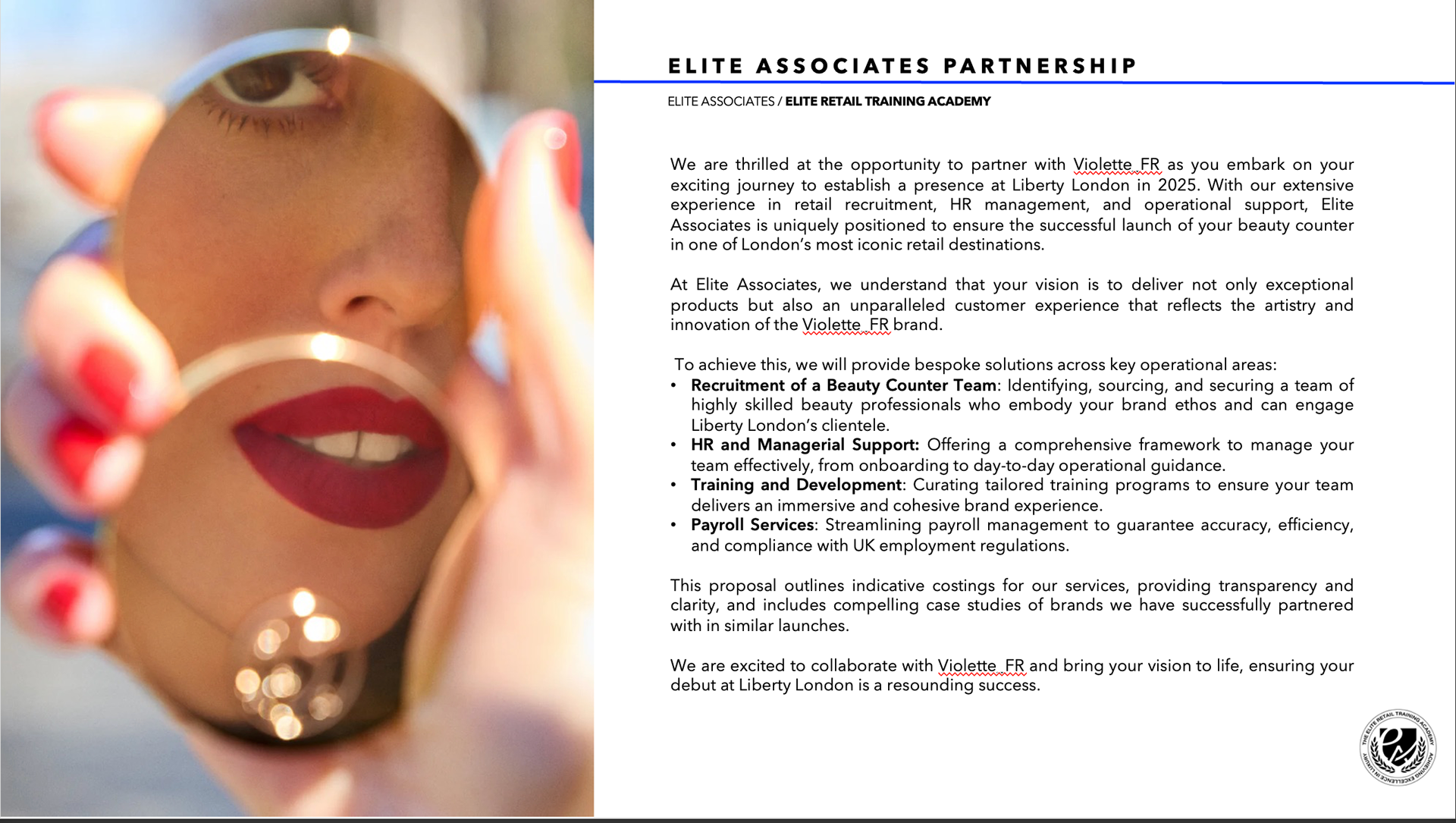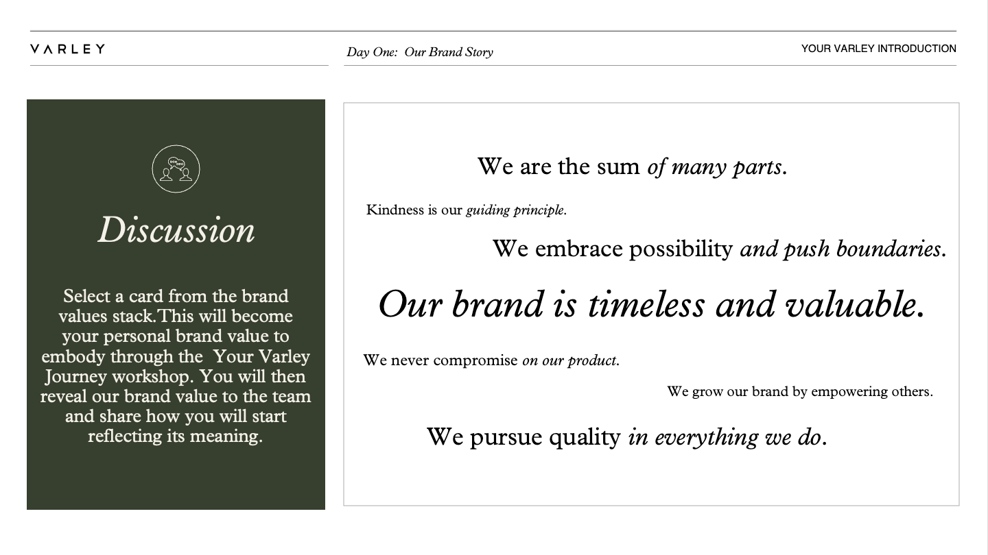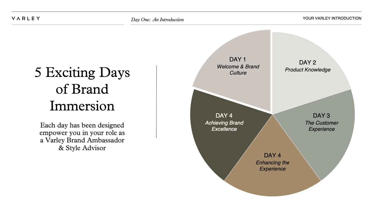The comprehensive presentation is an elevated document that merges training materials with their onboarding deck to reflect the brand’s move to be seen as higher end luxury.